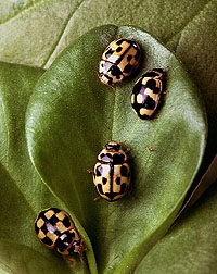 Three-sixteenths-inch-long Propylea quatuordecimpunctata (14-spot) lady beetles look for aphids on a fava bean leaf. Scientists think the beetles might be helpful in controlling Russian wheat aphids that now infest 17 Great Plains and Western states.