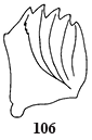 | Head without pigmented spot at genal angle; mandible with a projection on lateral margin (Fig. 106); pinacula concolorous with body in all instars ................................................................................................Diaphania indica Saunders complex Distribution: tropical worldwide, including Western Hemisphere Hosts: 2006: Coccinia sp., Cucurbita sp., Cucurbita pepo, Fernaldia sp., Luffa sp., Luffa acutangula, Momordica sp., Momordica charantia, Momordica balsimina, Murraya sp., Ocimum basilicum, Sechium edule, Thymus vulgaris pre-1998: Cucurbitaceae, including cucumber, cantaloupe, gourd, melon, pumpkin, squash Note: to separate pupae of D. hyalinata (L.) from D. indica (Saunders): proboscis extends to A7 in indica and to A8 or A9 in hyalinata; hyalinata occurs from Canada south to Argentina, indica is cosmopolitan, in the Western Hemisphere occurring from Florida to South America; see Whittle & Ferguson 1987a; Clavijo 1990. | ![]() | |