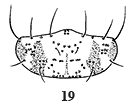 | Prothoracic shield with black areas on lateral margins and longitudinal black areas on either side midway between center line and lateral margins (black areas on either side of center line may be very faint) (Fig. 19) .............................................................................................................. Ancylostomia stercorea (Zeller) Distribution: tropical Western Hemisphere including southeastern U.S., Florida to Texas Hosts: 2006: Cajanus cajan, Lablab sp., Mangifera indica, Momordica charantia, Phaseolus sp., Phaseolus vulgaris, Pisum sp., Pisum sativum, Psidium guajava, Rumex sp. pre-1998: chick pea, cow pea Note: see Heinrich 1956 | ![]() | |