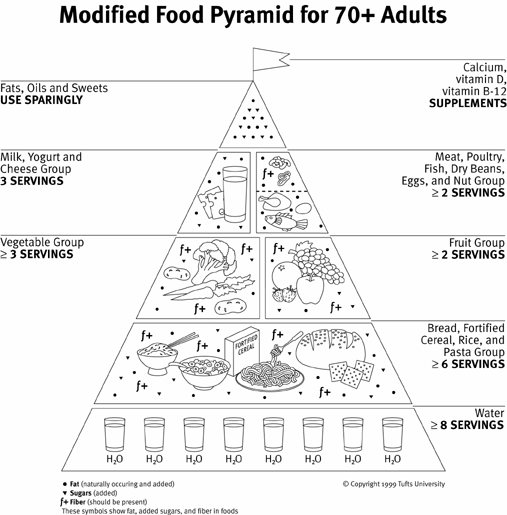 Food Pyramid for the 70+ GenerationRecognizing that the elderly need fewer calories than younger Americans, researchers have modified USDA's Food Guide Pyramid for the over-70 generation, hoping to optimize their nutrient intake. Published in the Journal of Nutrition (vol. 129, pp. 751-753), the modified pyramid emphasizes nutrient- dense foods, fiber and water and recognizes a possible need for supplements. Its base is narrower than the original pyramid to reflect the decrease in energy (calorie) needs. And it rests on a new base accenting the elderly's need for fluids—at least 2 quarts, or 8 cups, of water per day. Older people often have a reduced sense of thirst, and that can lead to dehydration. |